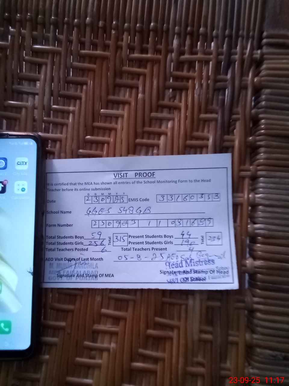 | Attendance Register | Head Teacher | MEA with School | Visit Proof |