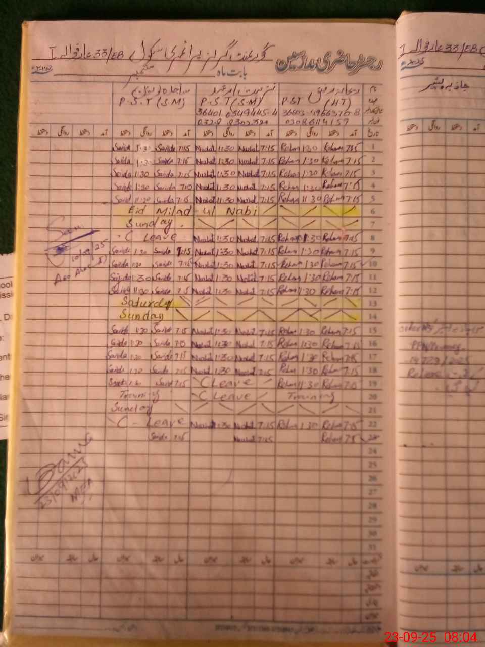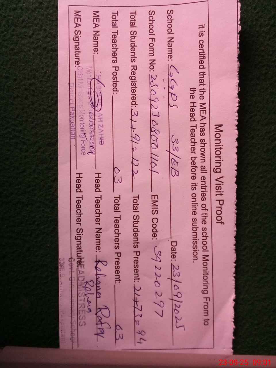 | Name: RE**** RA**** Designation: (School Headmaster's/Headmistress's) PST Phone/Cell Number: 03**** |