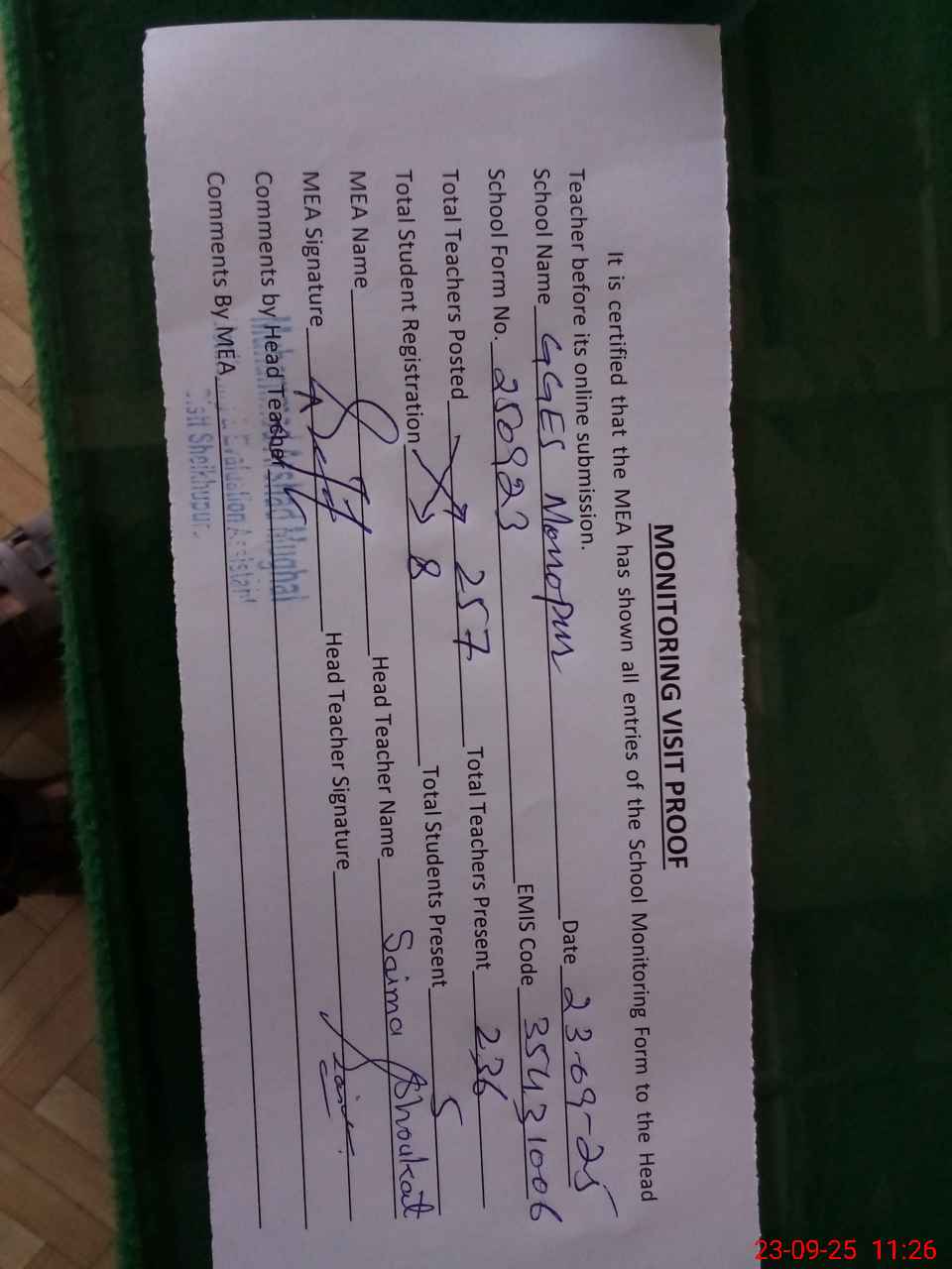 | Attendance Register | Head Teacher | MEA with School | Visit Proof |