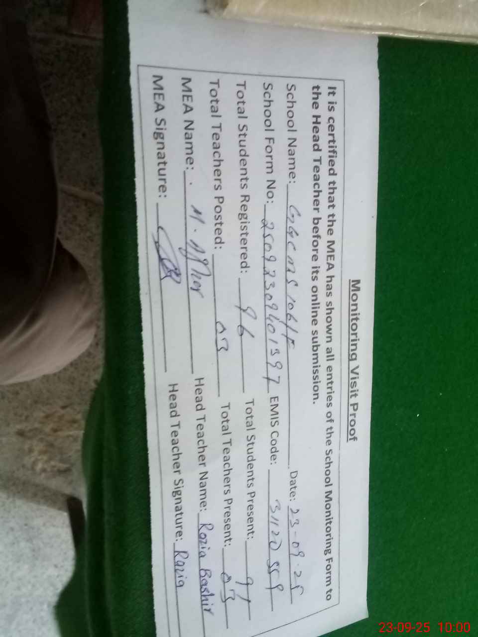 | Attendance Register | Head Teacher | MEA with School | Visit Proof |
