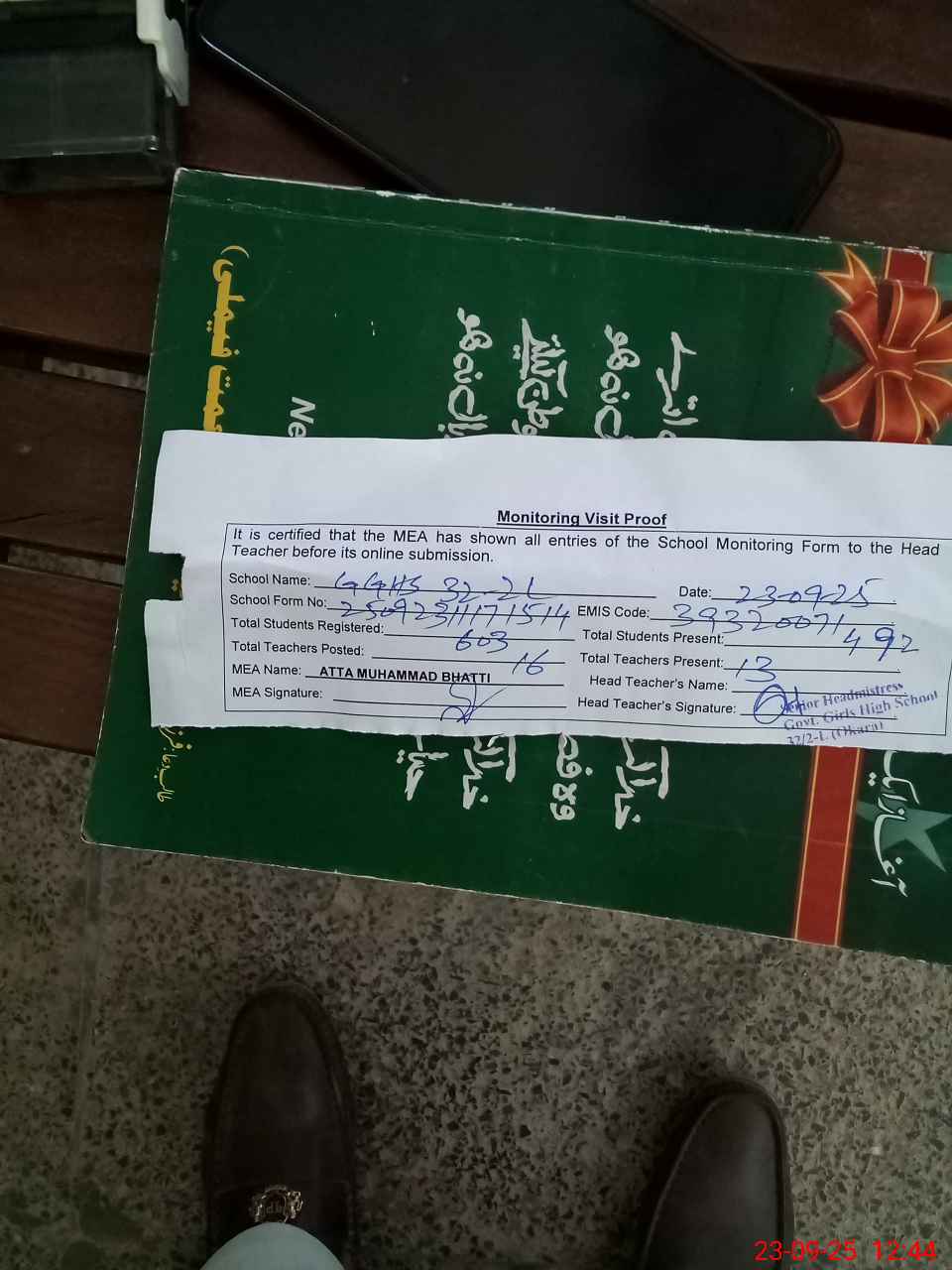 | Attendance Register | Head Teacher | MEA with School | Visit Proof |