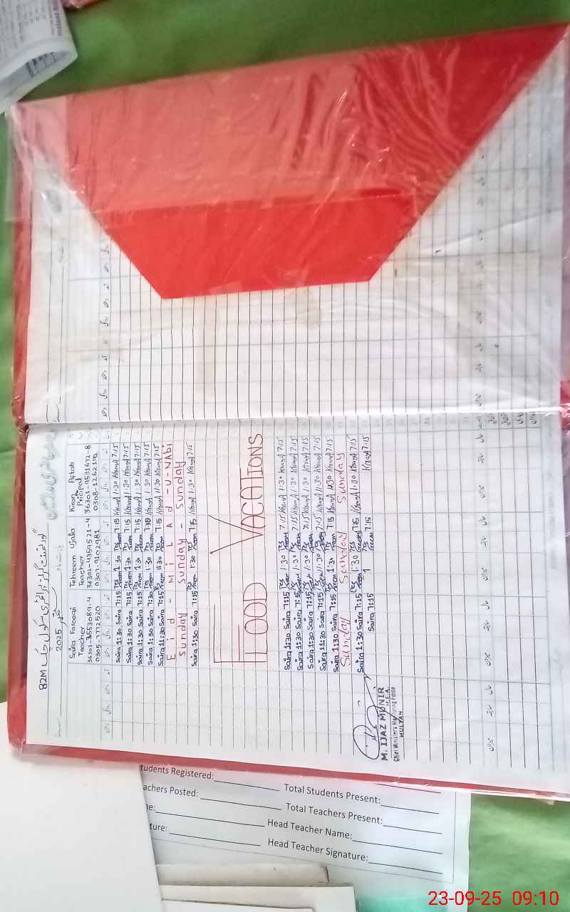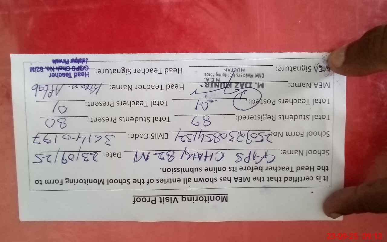 | Attendance Register | Head Teacher | MEA with School | Visit Proof |