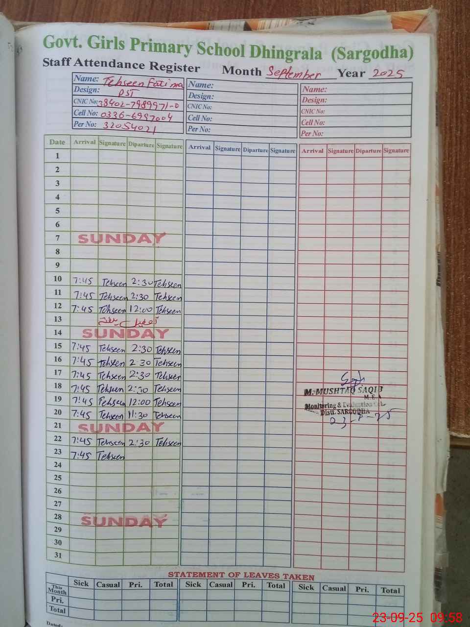 | CNIC | Full Name | Designation | R/C | Absence During Last Calender Month |