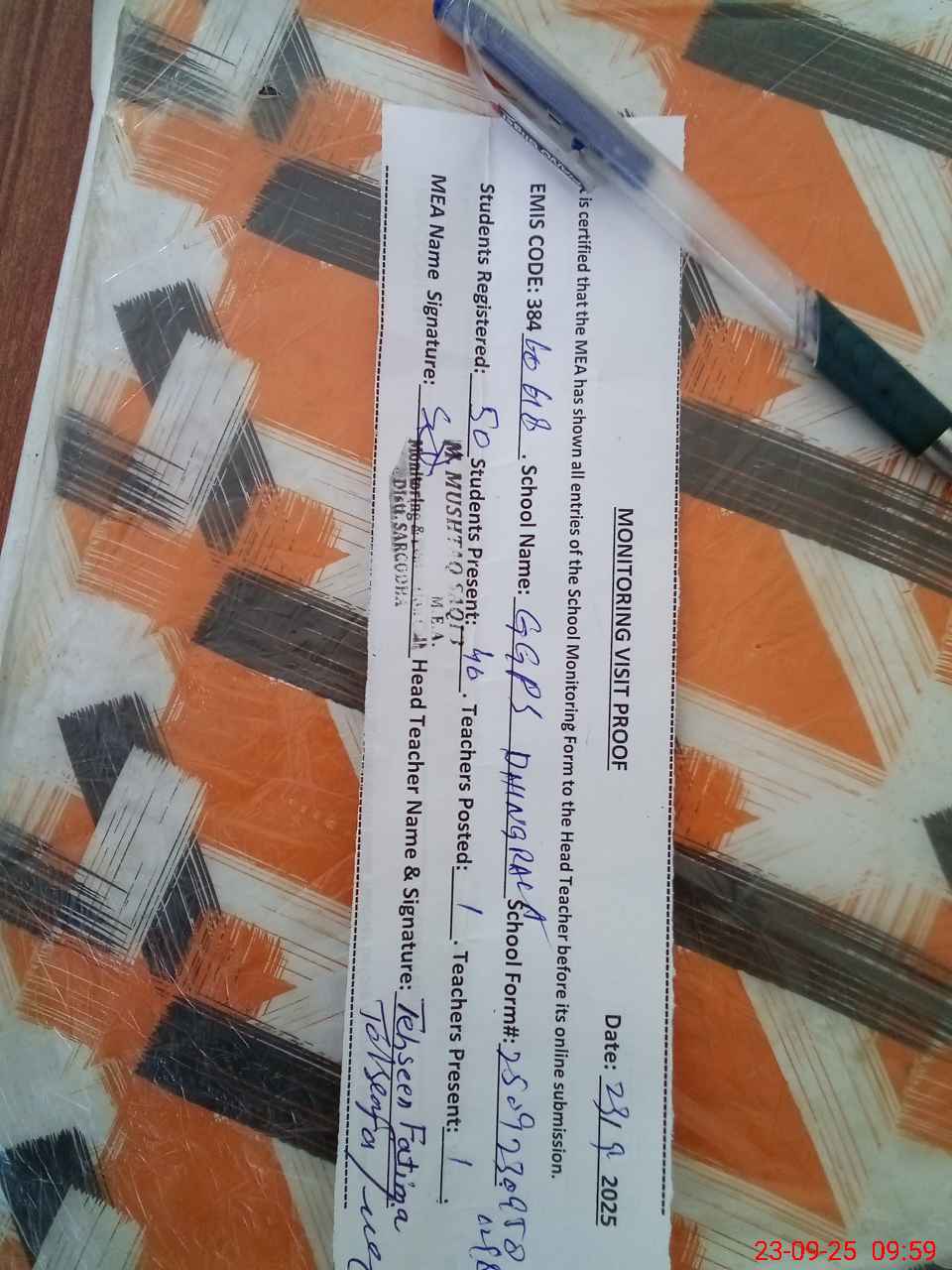 | Attendance Register | Head Teacher | MEA with School | Visit Proof |