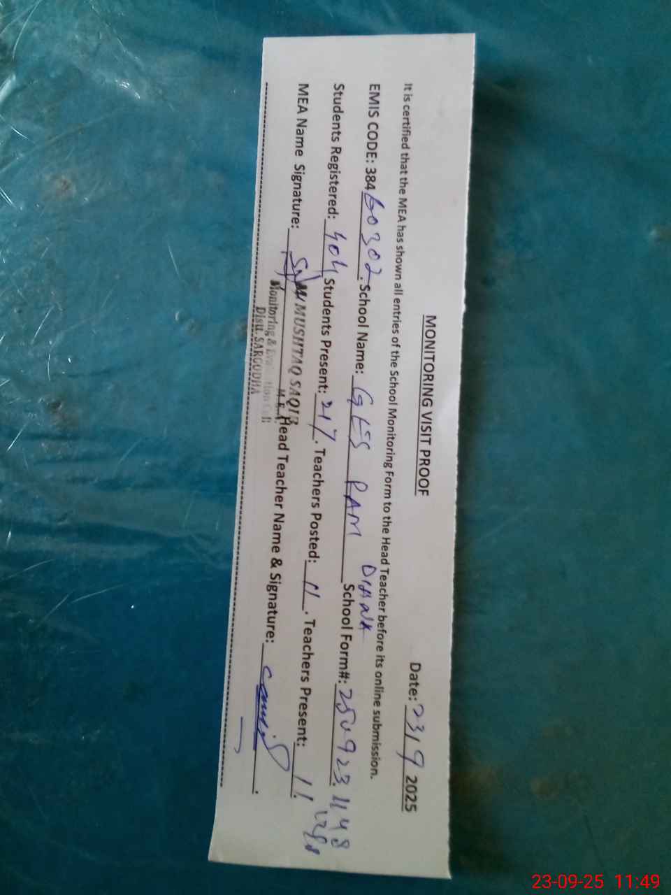 | Attendance Register | Head Teacher | MEA with School | Visit Proof |