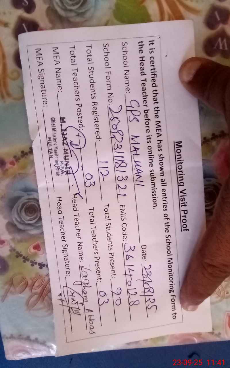 | Attendance Register | Head Teacher | MEA with School | Visit Proof |