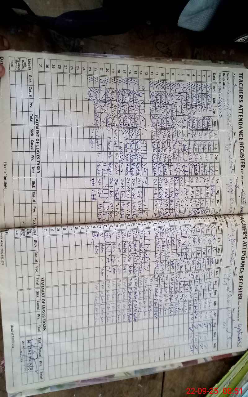 | CNIC | Full Name | Designation | R/C | Absence During Last Calender Month |