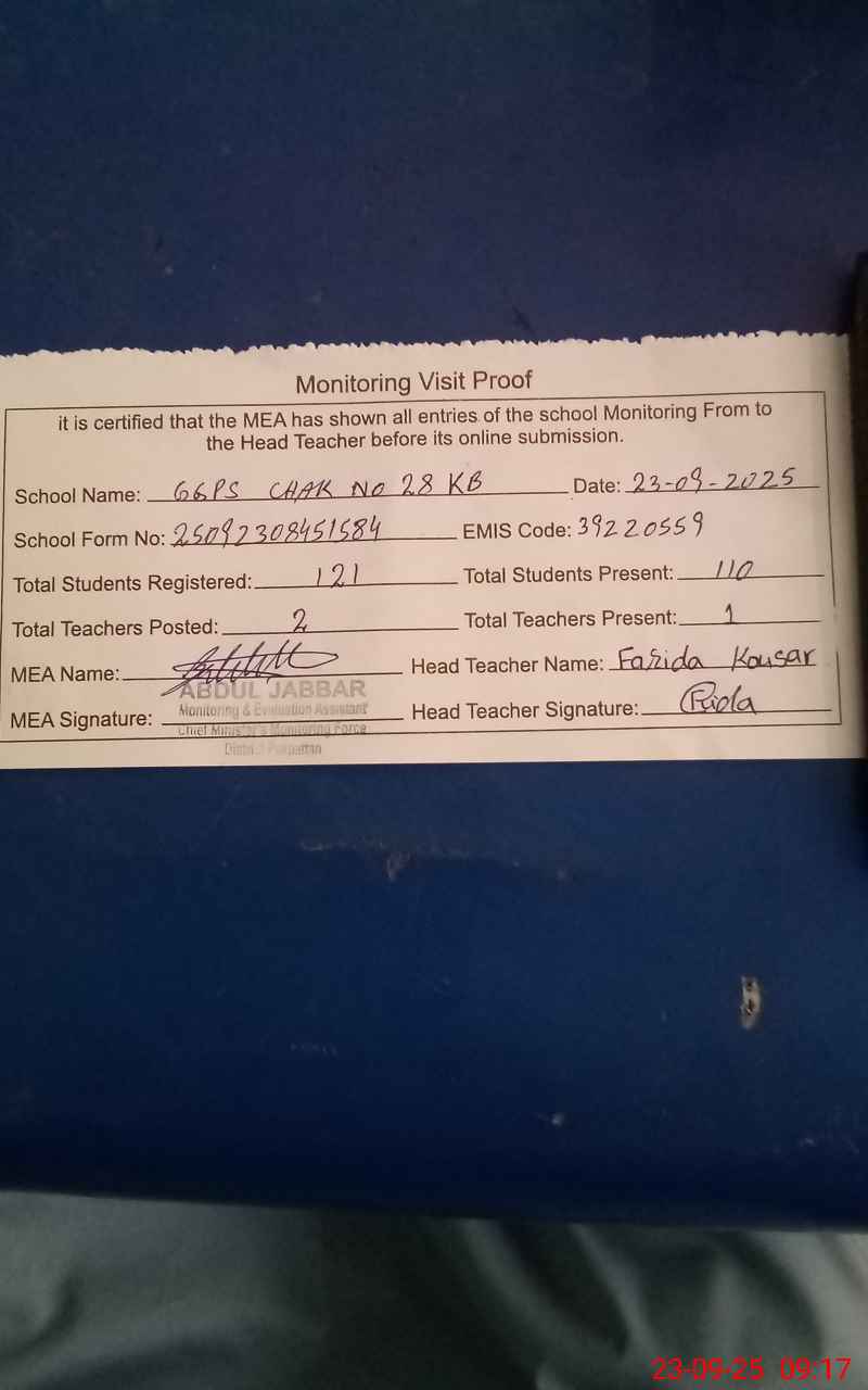 | Attendance Register | Head Teacher | MEA with School | Visit Proof |