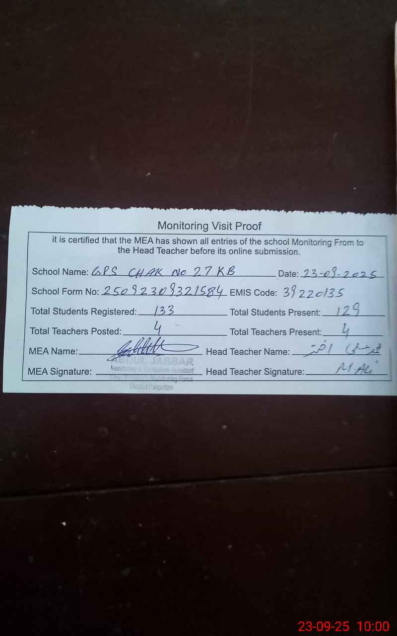 | EMIS Code: 39220135 | Name of School: GPS CHAK NO. 27 KB P.O QABOOLA | |||