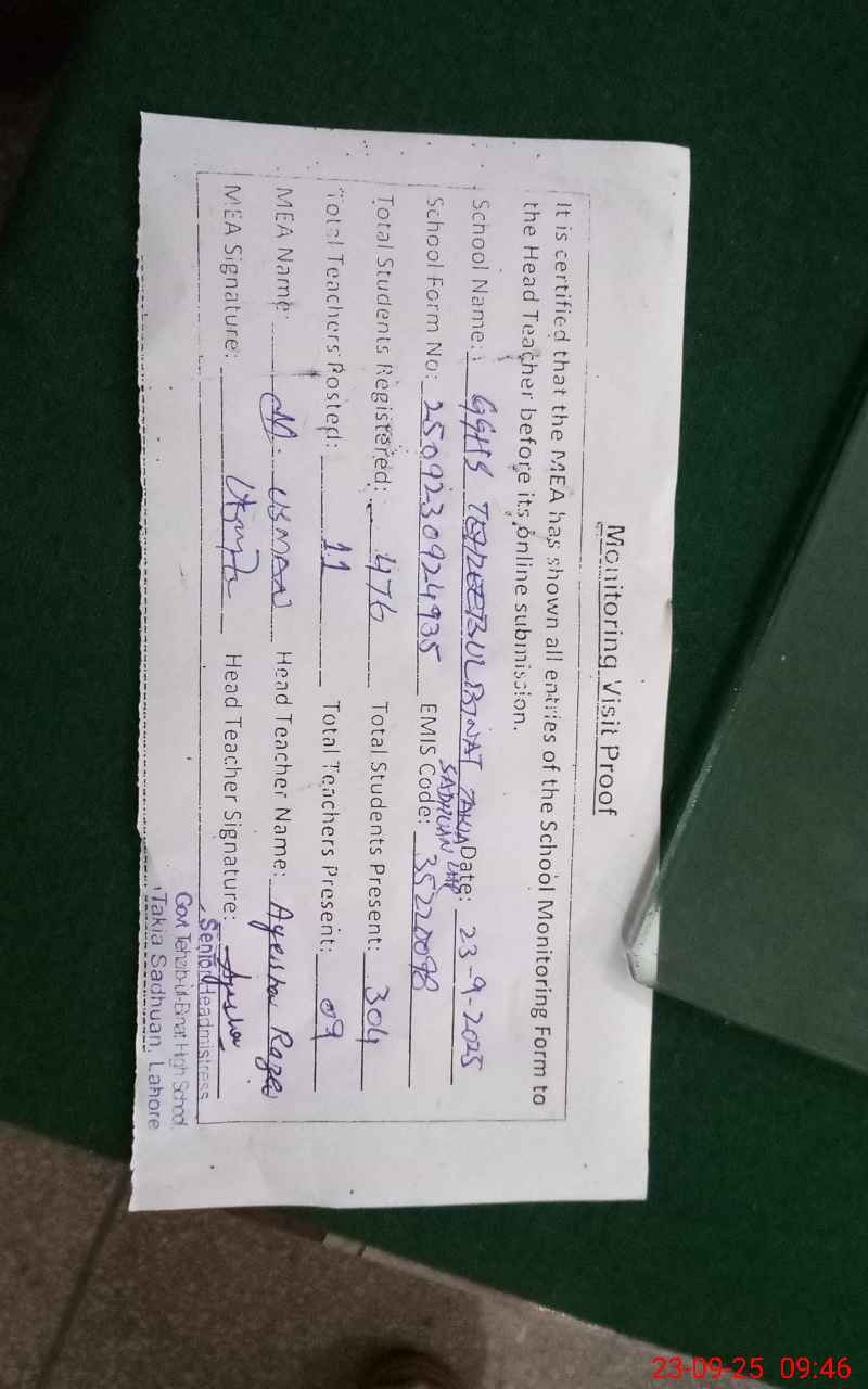 | EMIS Code: 35220098 | Name of School: GGHS TEHZEEB-UL-BINAT TAKIA SADHUAN LAHORE | |||