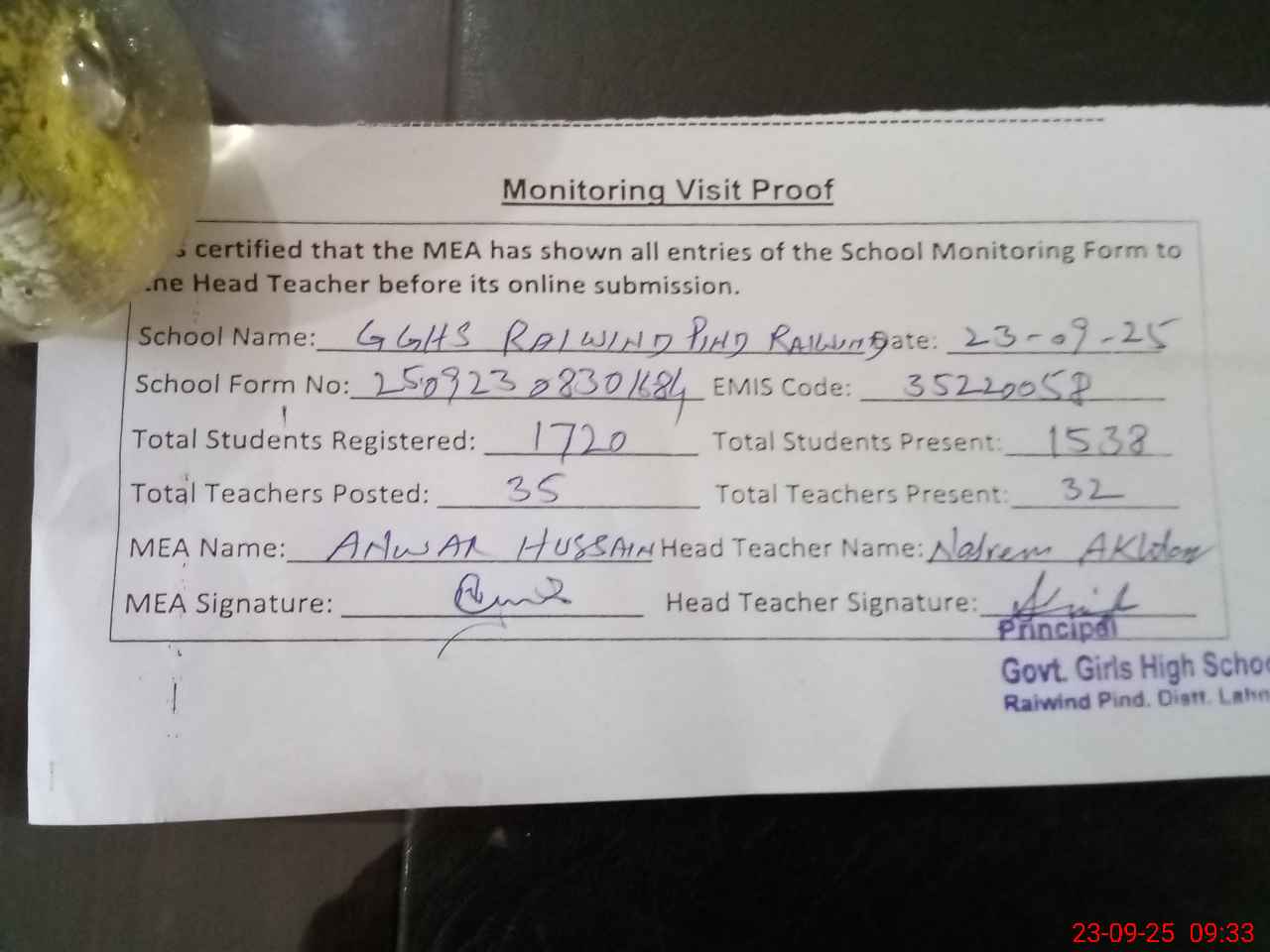 | Attendance Register | Head Teacher | MEA with School | Visit Proof |