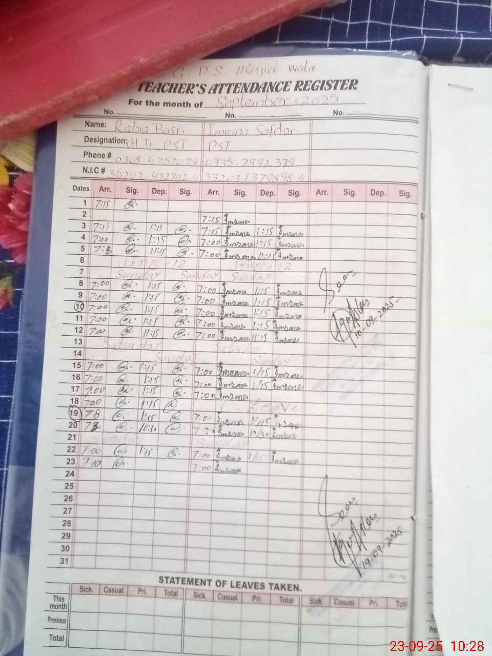 | Name: RA**** BA**** Designation: (School Headmaster's/Headmistress's) PST Phone/Cell Number: 03**** |