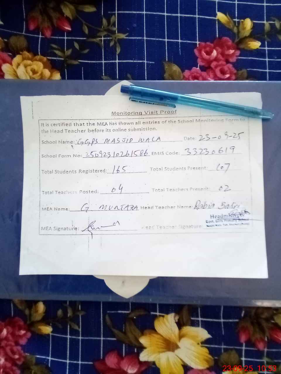 | Attendance Register | Head Teacher | MEA with School | Visit Proof |