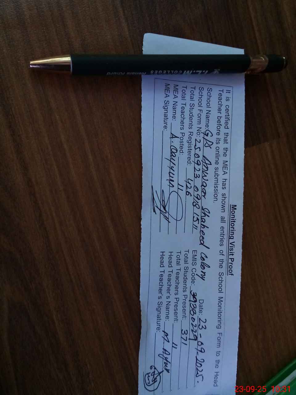 | Attendance Register | Head Teacher | MEA with School | Visit Proof |