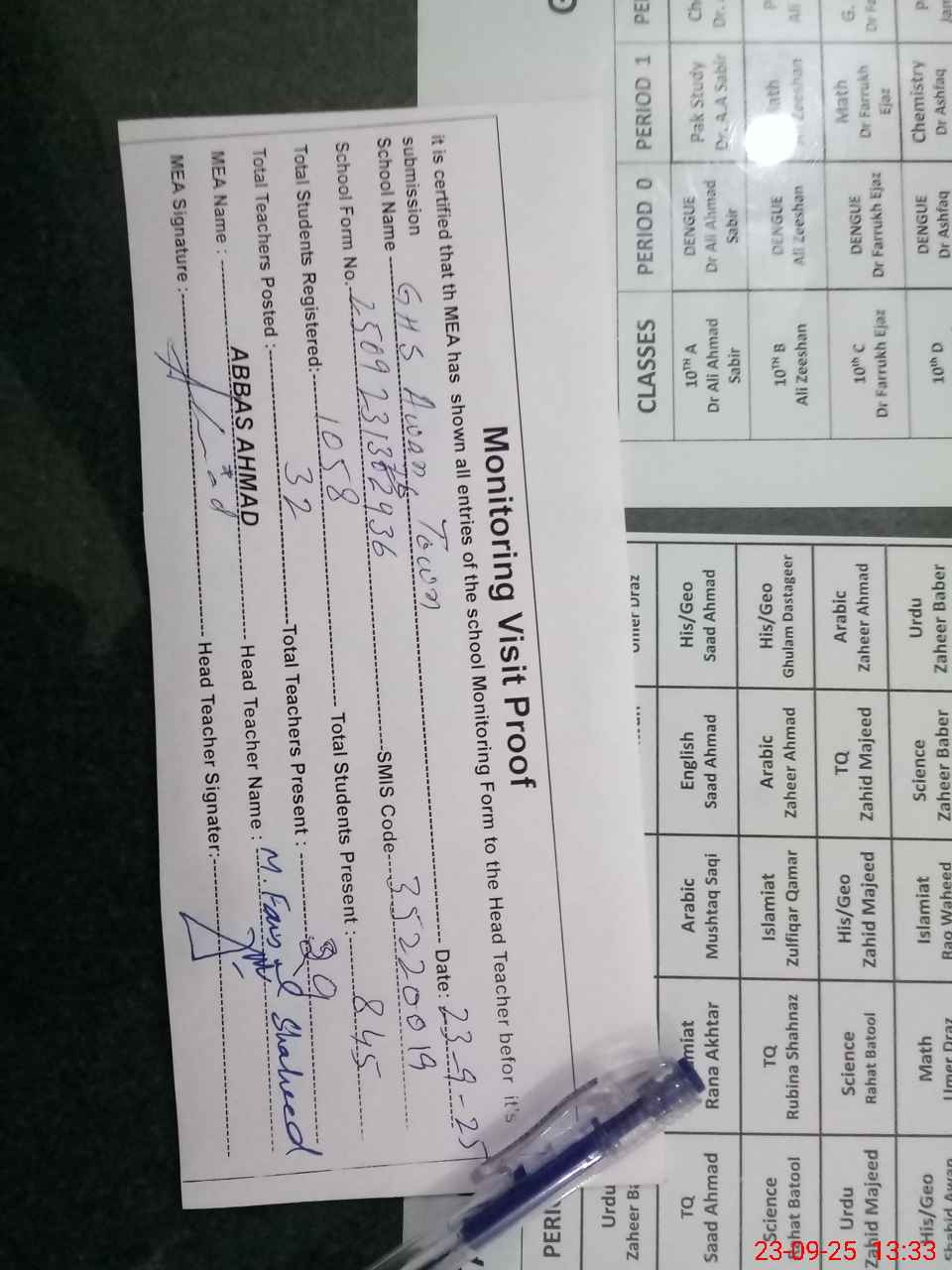 | Certified that this School was Inspected by the Undersigned MEA/DMO Today and the Information Stated Above is as Per Record. | |||||