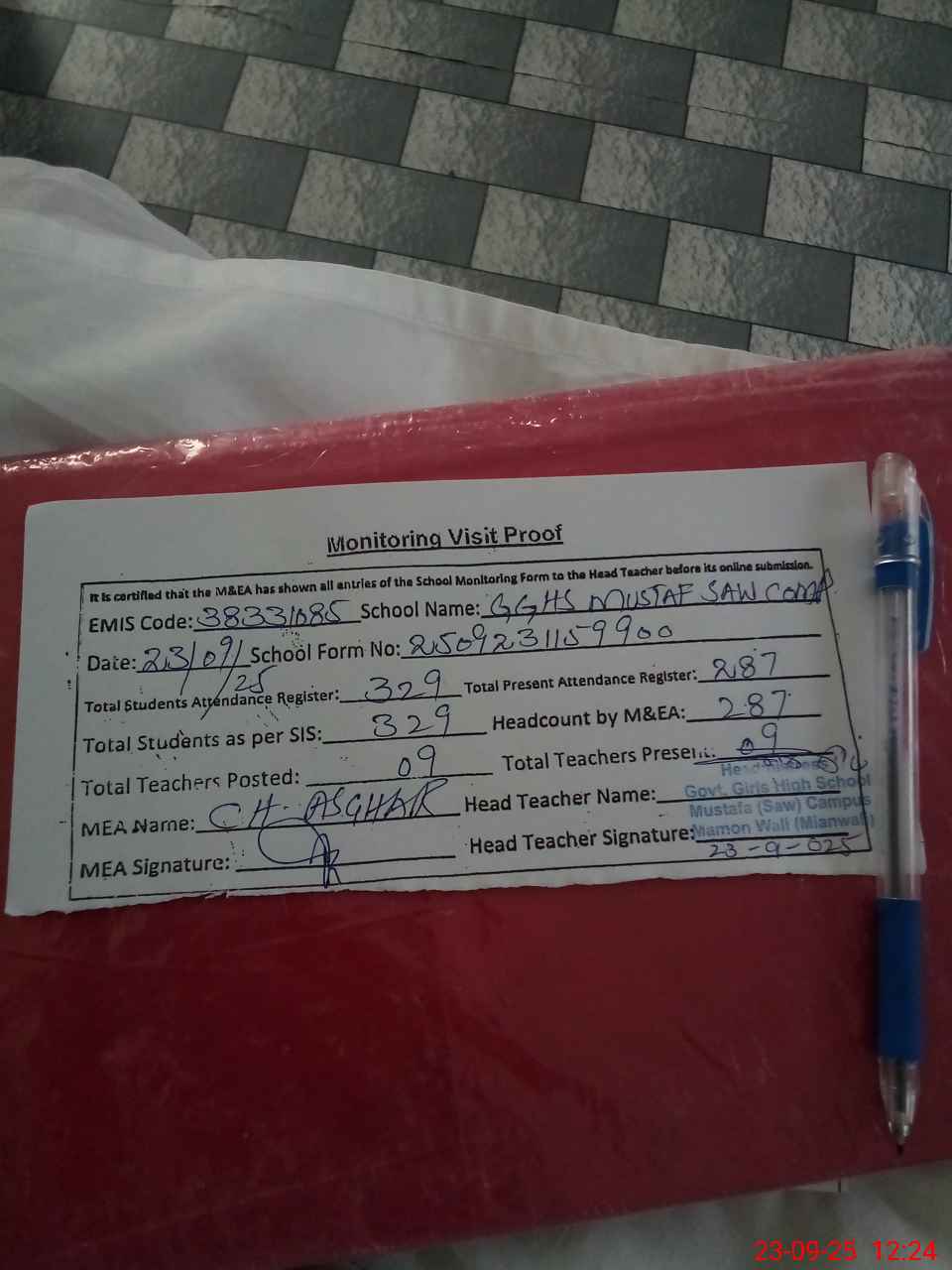 | Attendance Register | Head Teacher | MEA with School | Visit Proof |