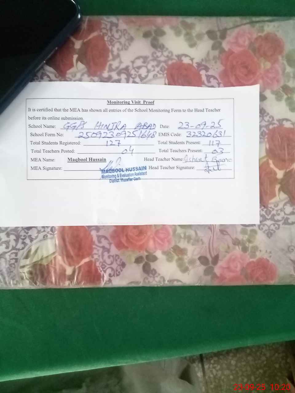 | EMIS Code: 32320631 | Name of School: GGPS HINJRA ABAD | |||