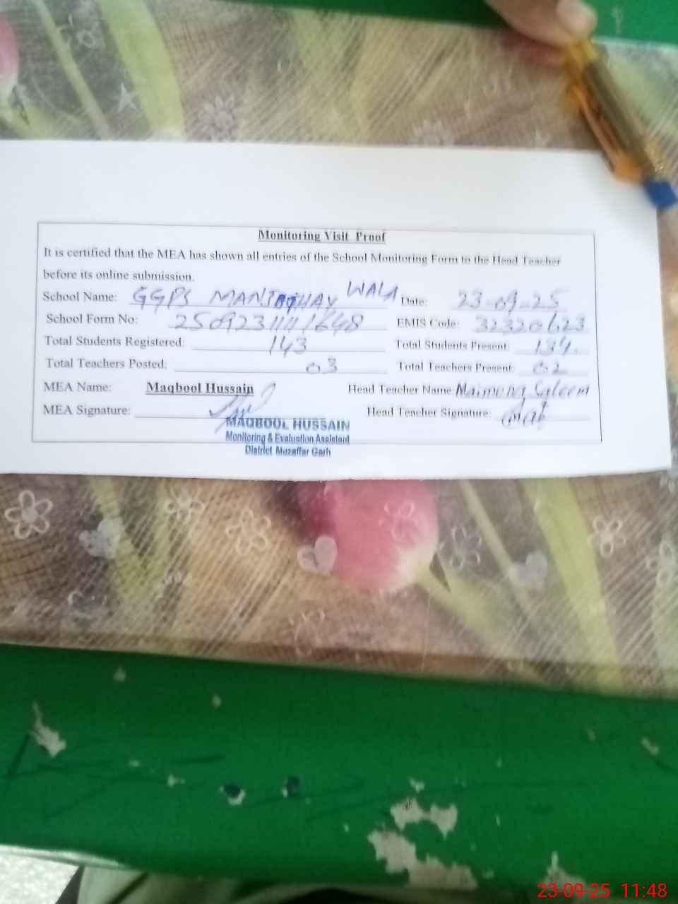 | Attendance Register | Head Teacher | MEA with School | Visit Proof |