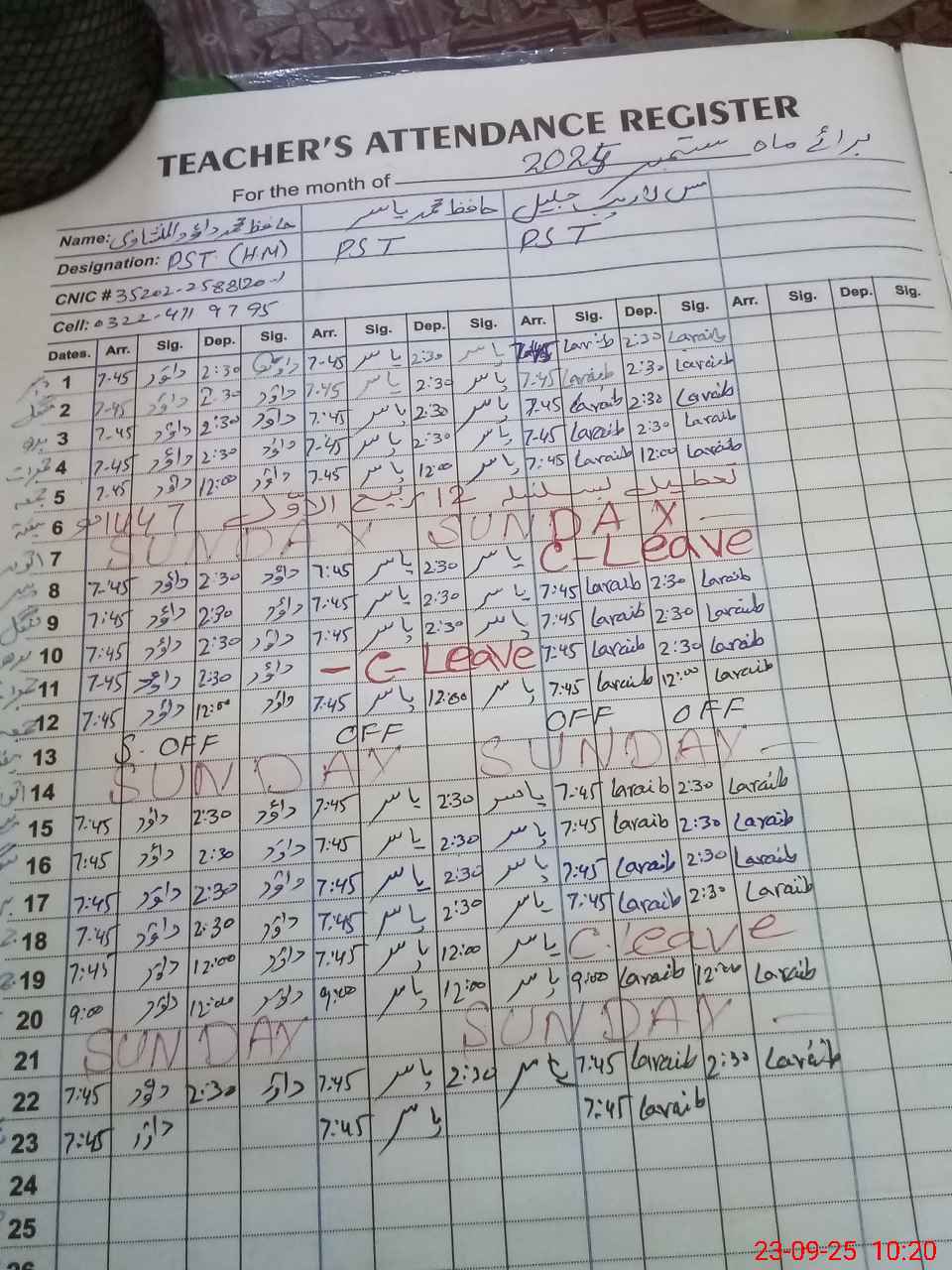 | CNIC | Full Name | Designation | R/C | Absence during last cal. month |