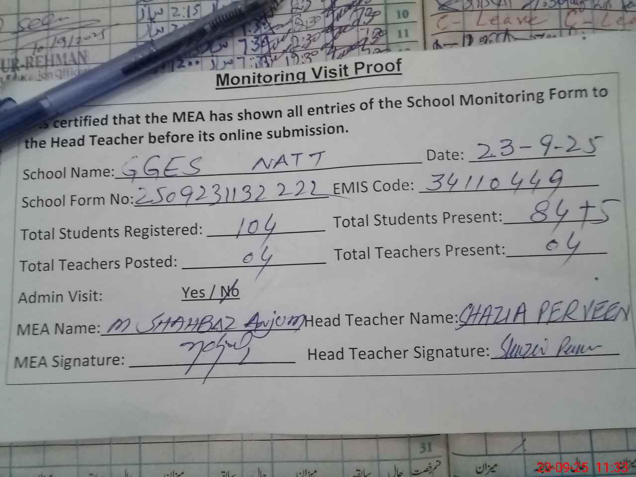 | Attendance Register | Head Teacher | MEA with School | Visit Proof |