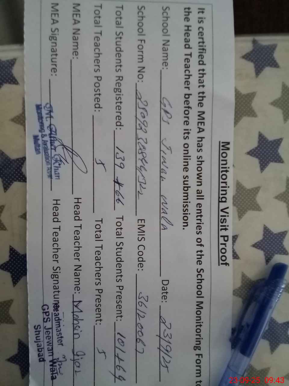| EMIS Code: 36120067 | Name of School: GPS JIWAN WALA P/O SHUJABAD | |||