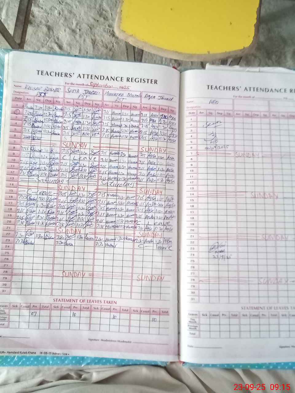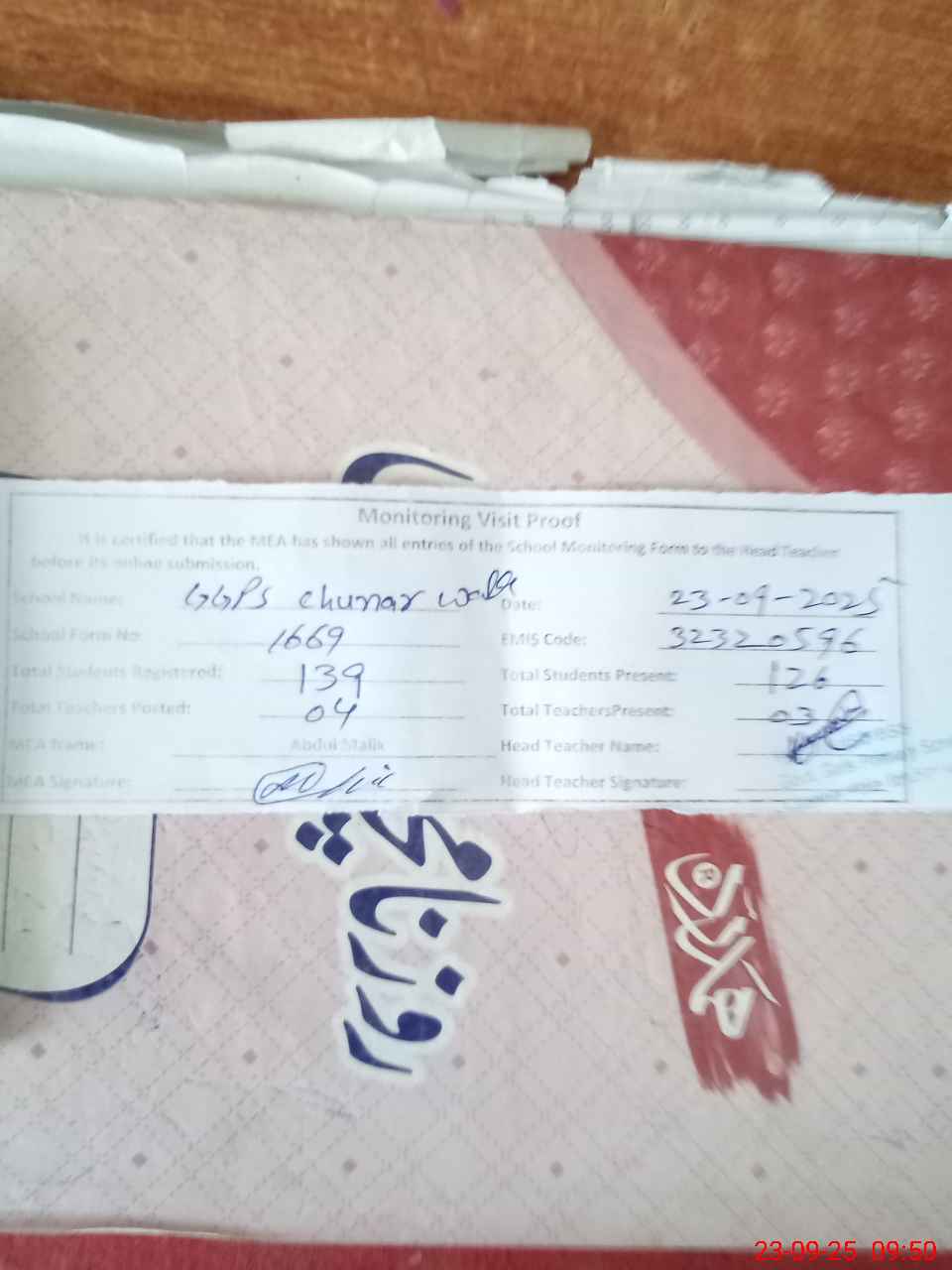 | Attendance Register | Head Teacher | MEA with School | Visit Proof |