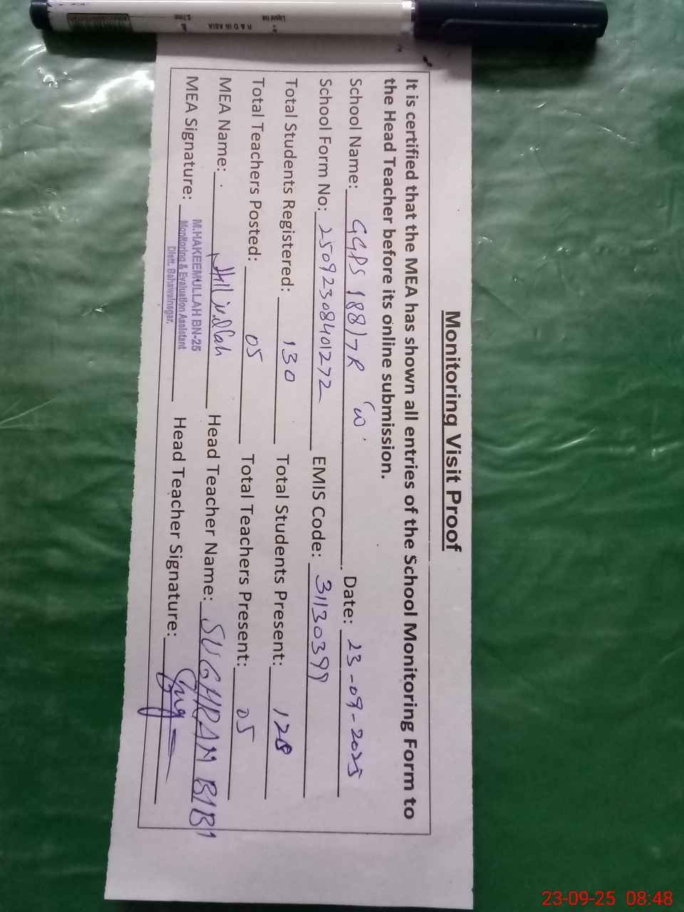 | Attendance Register | Head Teacher | MEA with School | Visit Proof |