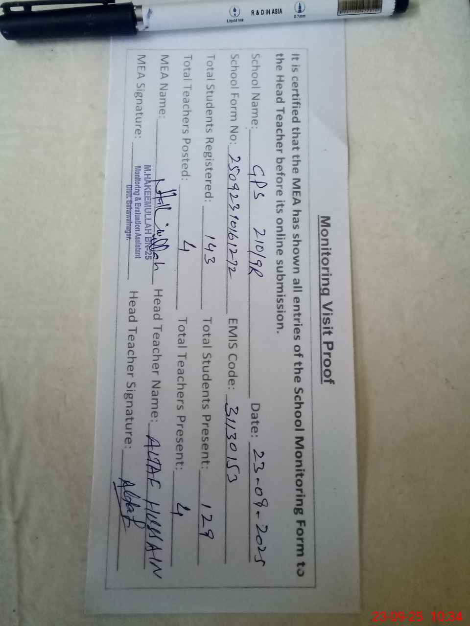 | Attendance Register | Head Teacher | MEA with School | Visit Proof |