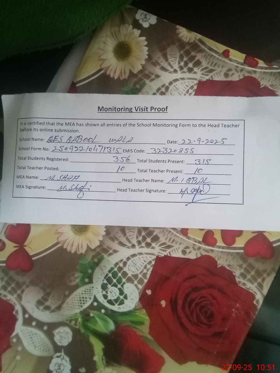 | Attendance Register | Head Teacher | MEA with School | Visit Proof |