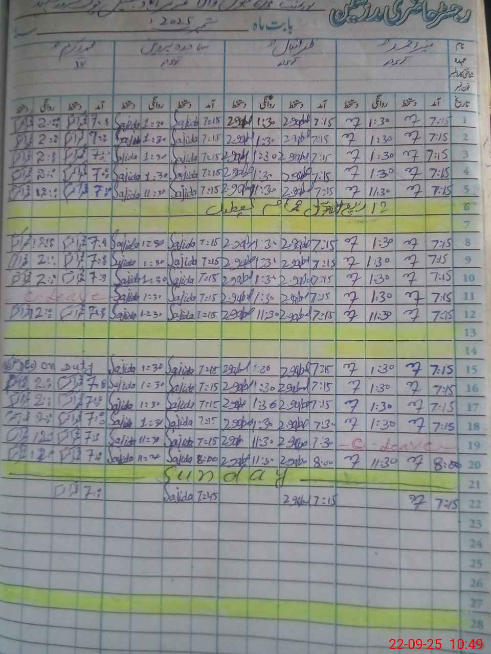 | CNIC | Full Name | Designation | R/C | Absence During Last Calender Month |