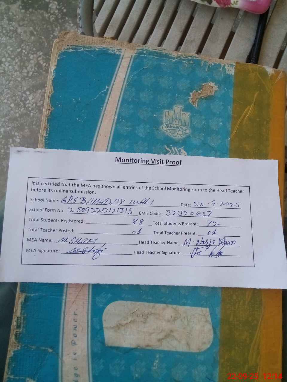 | EMIS Code: 32320827 | Name of School: GPS BAHADAR WALI | |||
