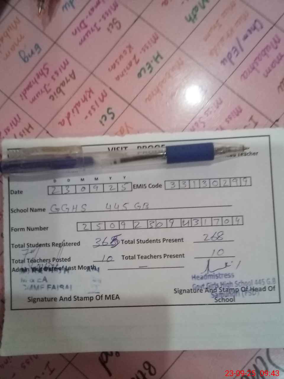 | Attendance Register | Head Teacher | MEA with School | Visit Proof |
