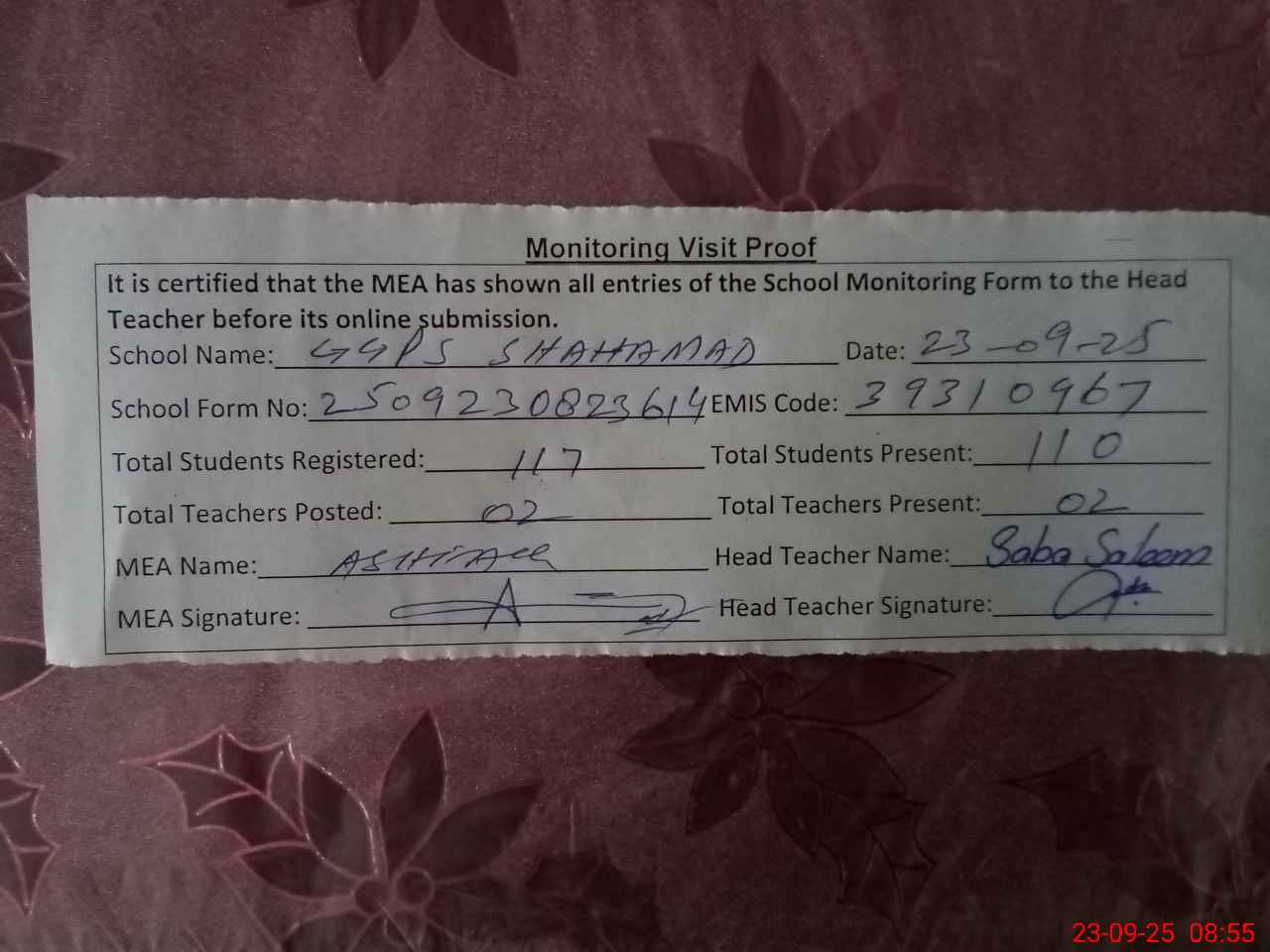 | Attendance Register | Head Teacher | MEA with School | Visit Proof |