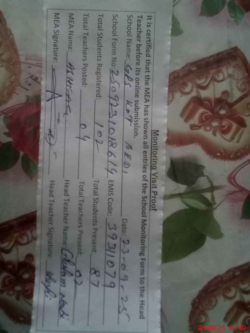 | Attendance Register | Head Teacher | MEA with School | Visit Proof |