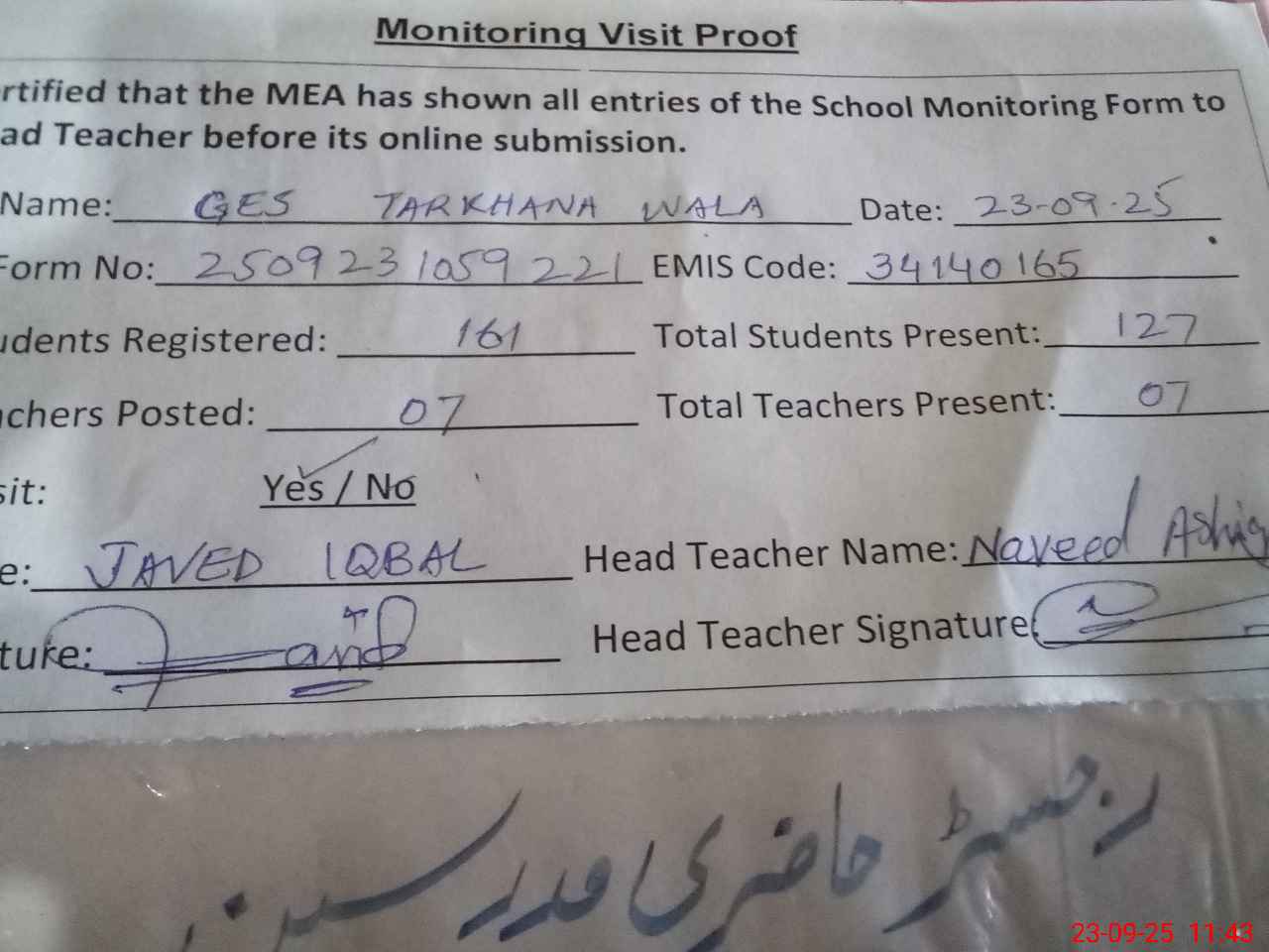 | Attendance Register | Head Teacher | MEA with School | Visit Proof |