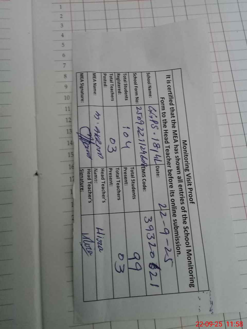 | Attendance Register | Head Teacher | MEA with School | Visit Proof |