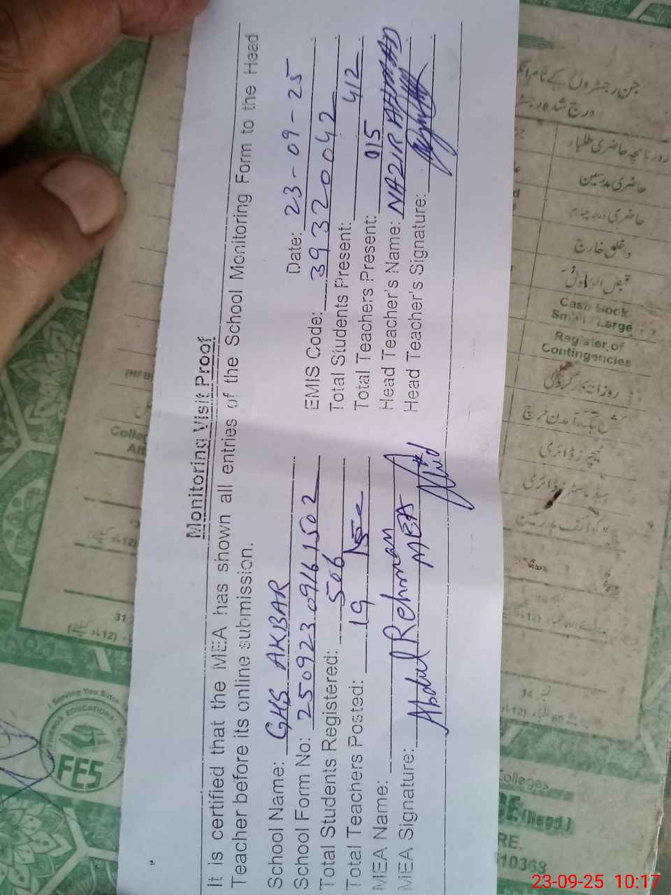 | Attendance Register | Head Teacher | MEA with School | Visit Proof |
