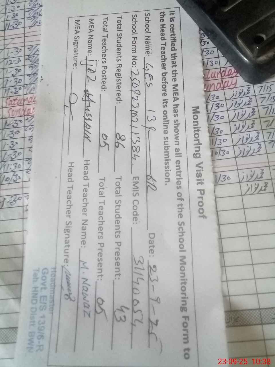| Attendance Register | Head Teacher | MEA with School | Visit Proof |