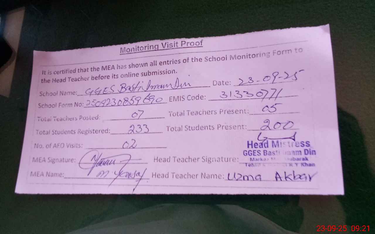 | EMIS Code: 31330771 | Name of School: GGES BASTI IMAM DIN | |||