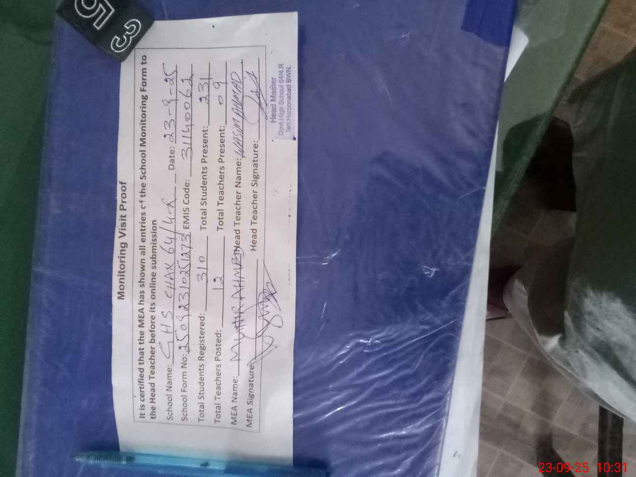 | Attendance Register | Head Teacher | MEA with School | Visit Proof |