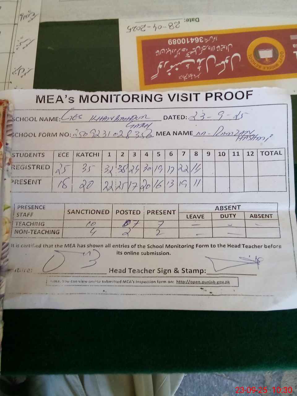 | Attendance Register | Head Teacher | MEA with School | Visit Proof |