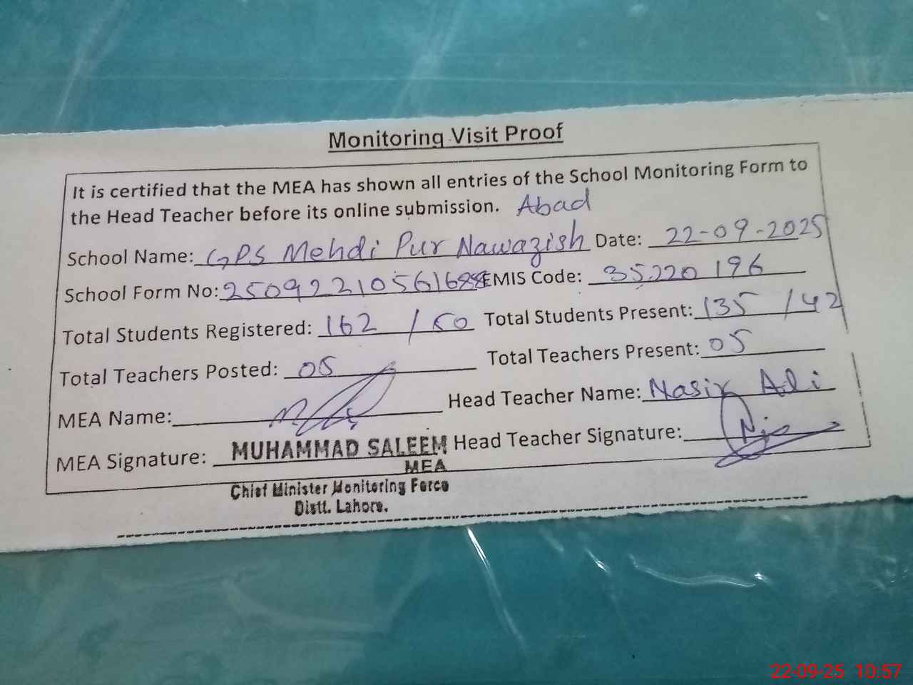 | Remarks (Use Separate Page if Required): ESE Teacher Sunila Joseph terminated from service wef 24th July 2024 by order no 1776 E III of DEO MEE Lahore same dated but hes name in PMIU Monthly Monitoring application teaching staff list of said school is still exists Due to shortage of classrooms nursery class accommodated in ECE class room ECE students not have Age appropriate furniture also ECE kit partially available The school did not have FTF fund account however record on register available last NSB fund status not updated on SIS Water bore of school is not working properly water available is not drinkable head teacher and school staff is arranging drinking water from nabour society but not sufficient for all students There are 12 students less registered in SIS head teacher told it due to some issues in application he will registered them as soon as possible 35220196 | |||||