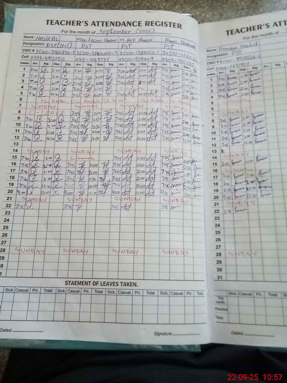 | CNIC | Full Name | Designation | R/C | Absence During Last Calender Month |