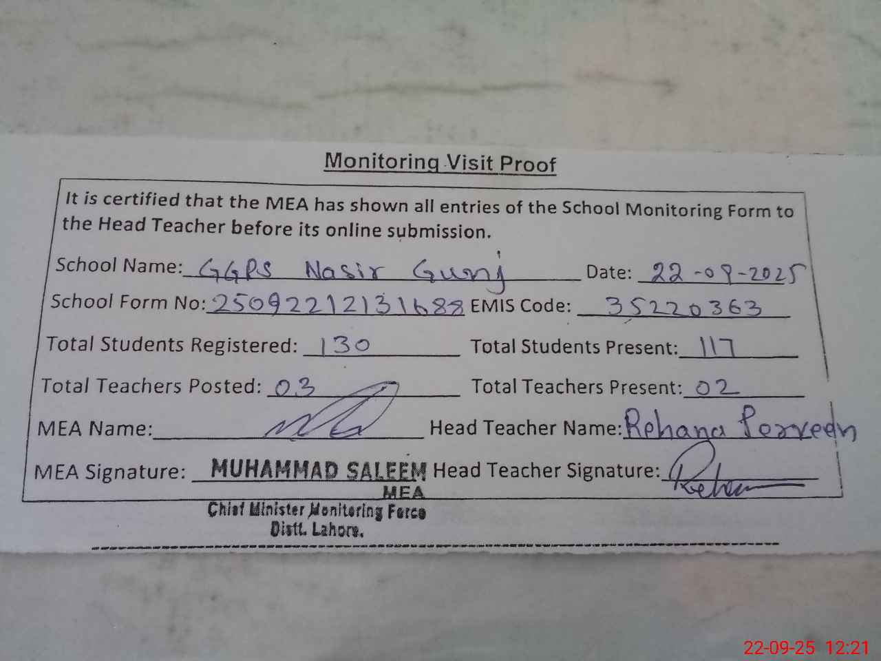 | Attendance Register | Head Teacher | MEA with School | Visit Proof |