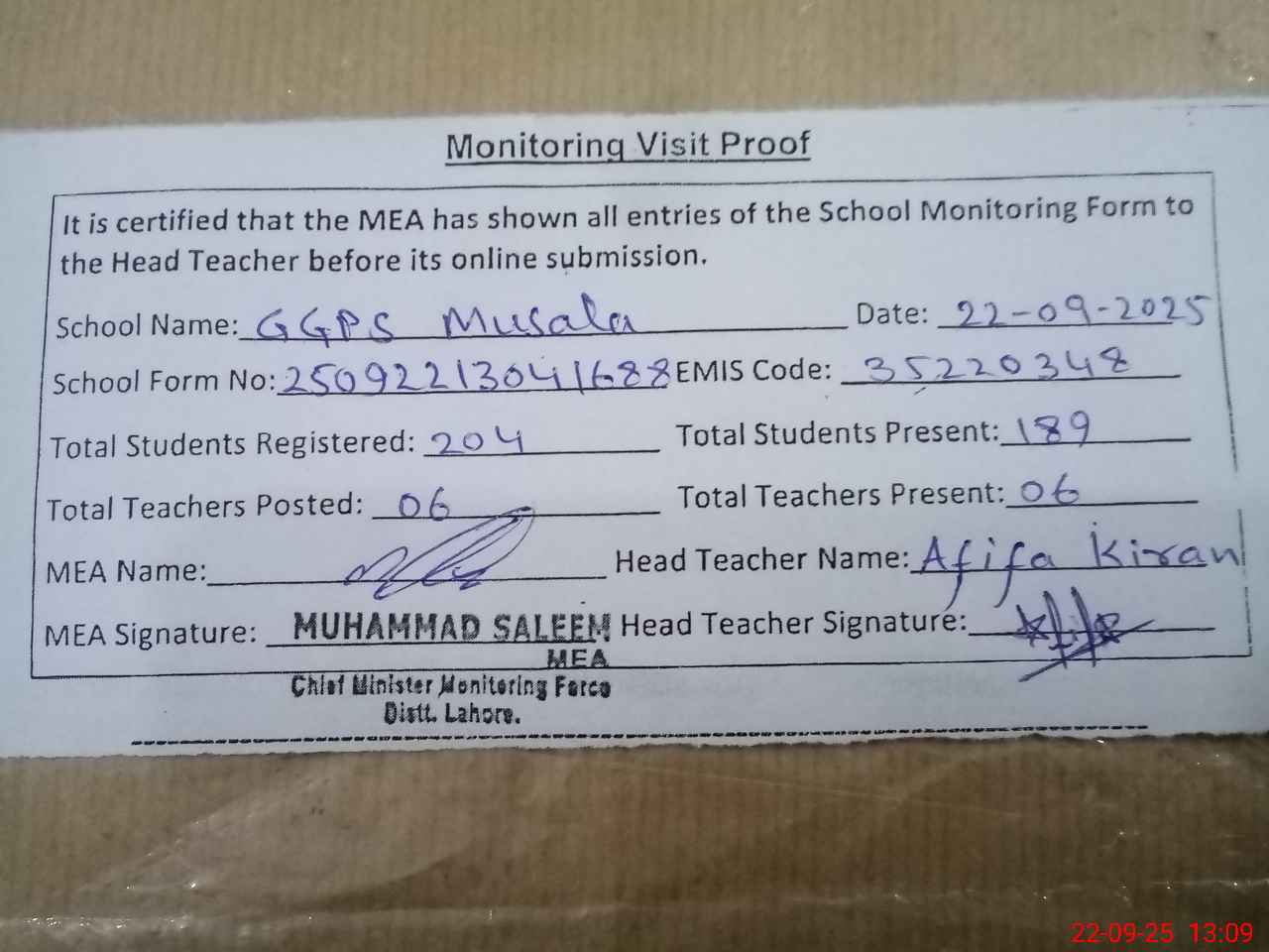 | Remarks (Use Separate Page if Required): SG Qasim Ali Shah is on temporary duty since 2019 his current order for temporary duty not available in the school so marked him absent as per SOP Class three students are accommodated in ECE class room with ECE students due to shortage of class rooms ECE kit found partially available One new classroom construction work is in progress in the school with the help of NSB and some personally school staff help 35220348 | |||||