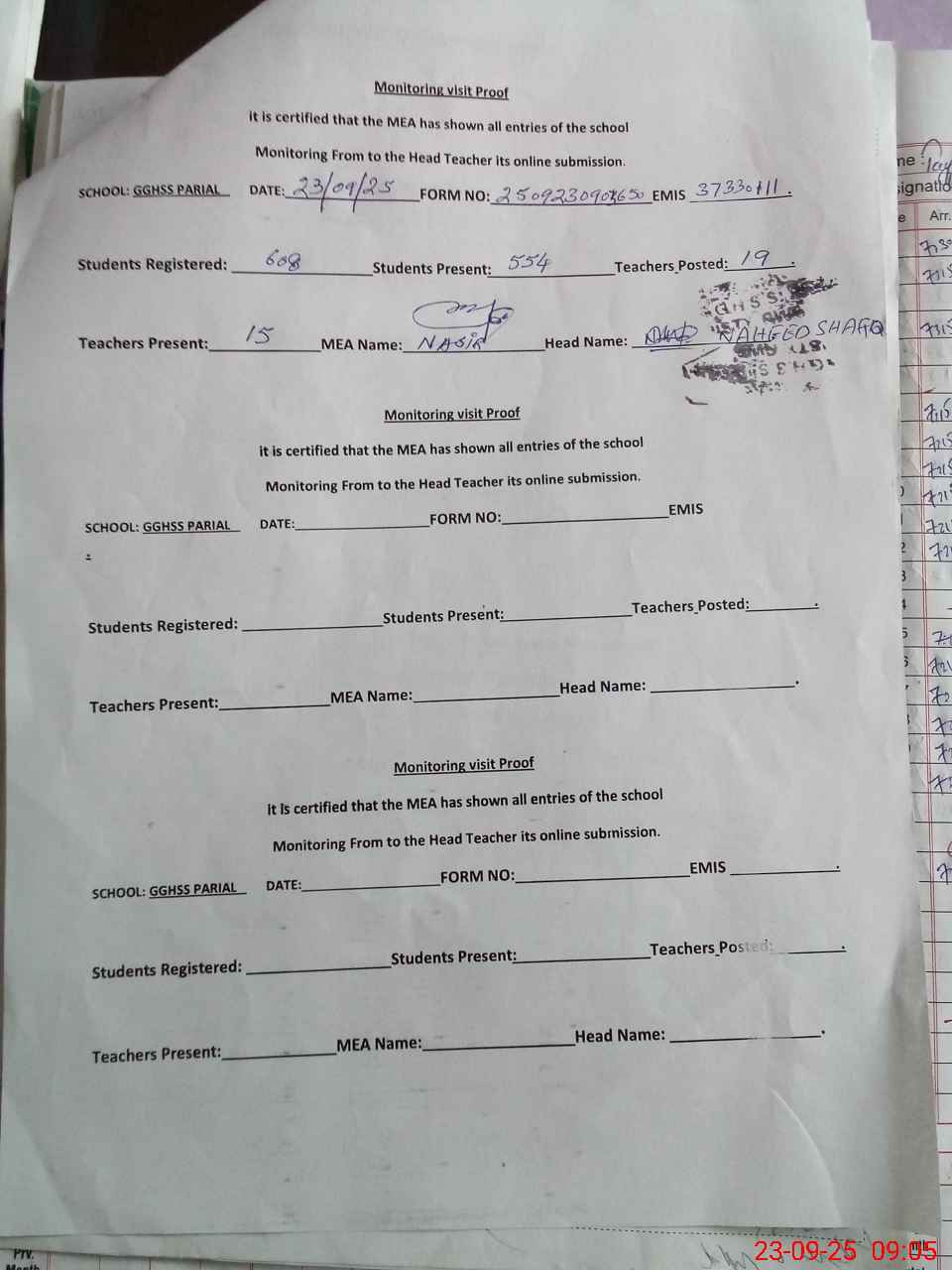 | Monitoring Date: 23-09-2025 | Start Time: 23-09-2025 08:29 AM | End Time: 23-09-2025 09:09 AM | Name of MEA: Rt**** Na**** Me**** | |