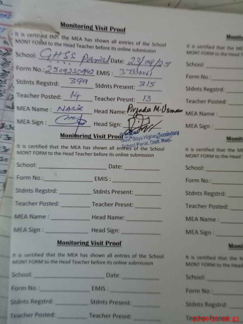 | Attendance Register | Head Teacher | MEA with School | Visit Proof |