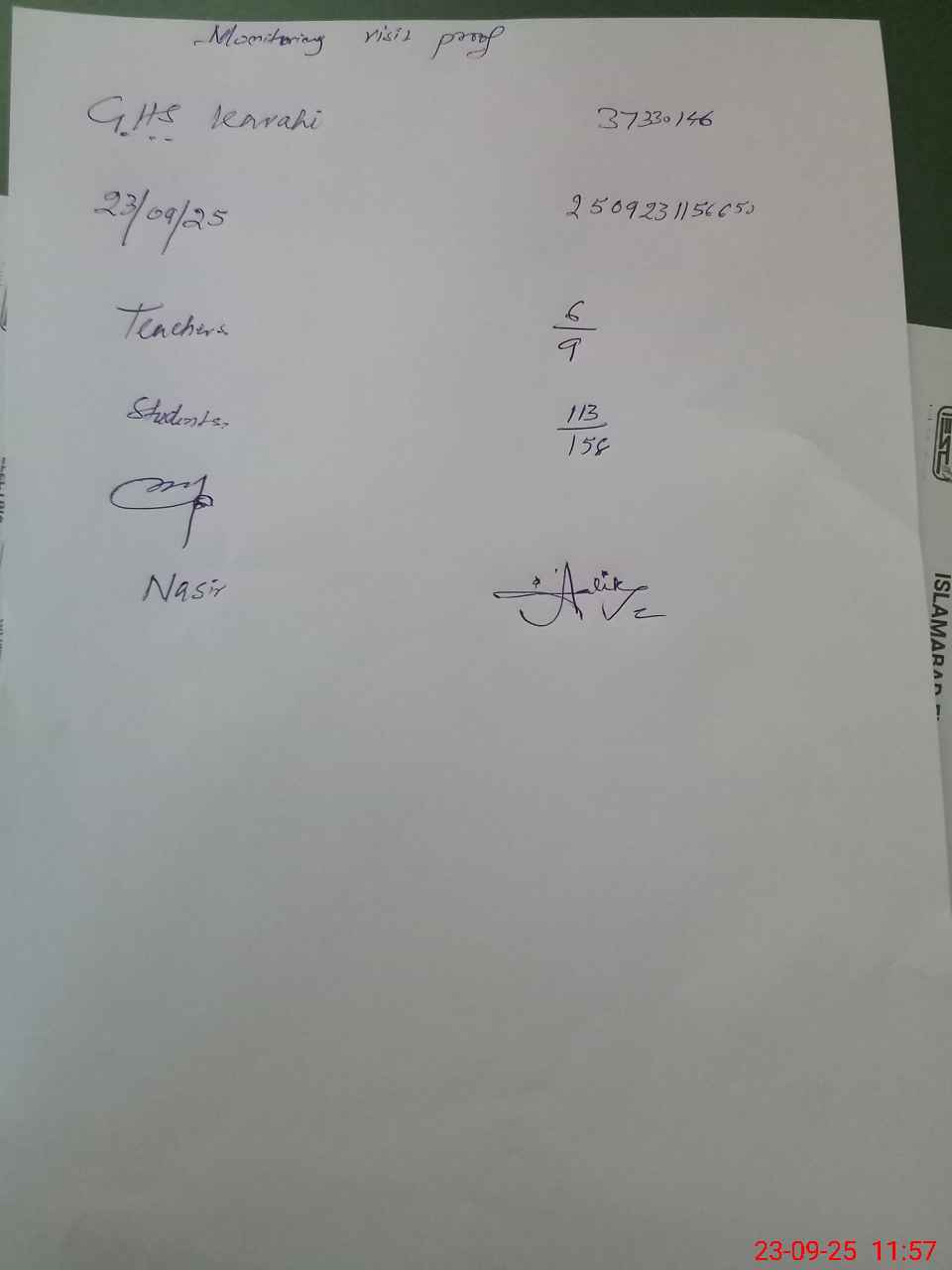 | Attendance Register | Head Teacher | MEA with School | Visit Proof |
