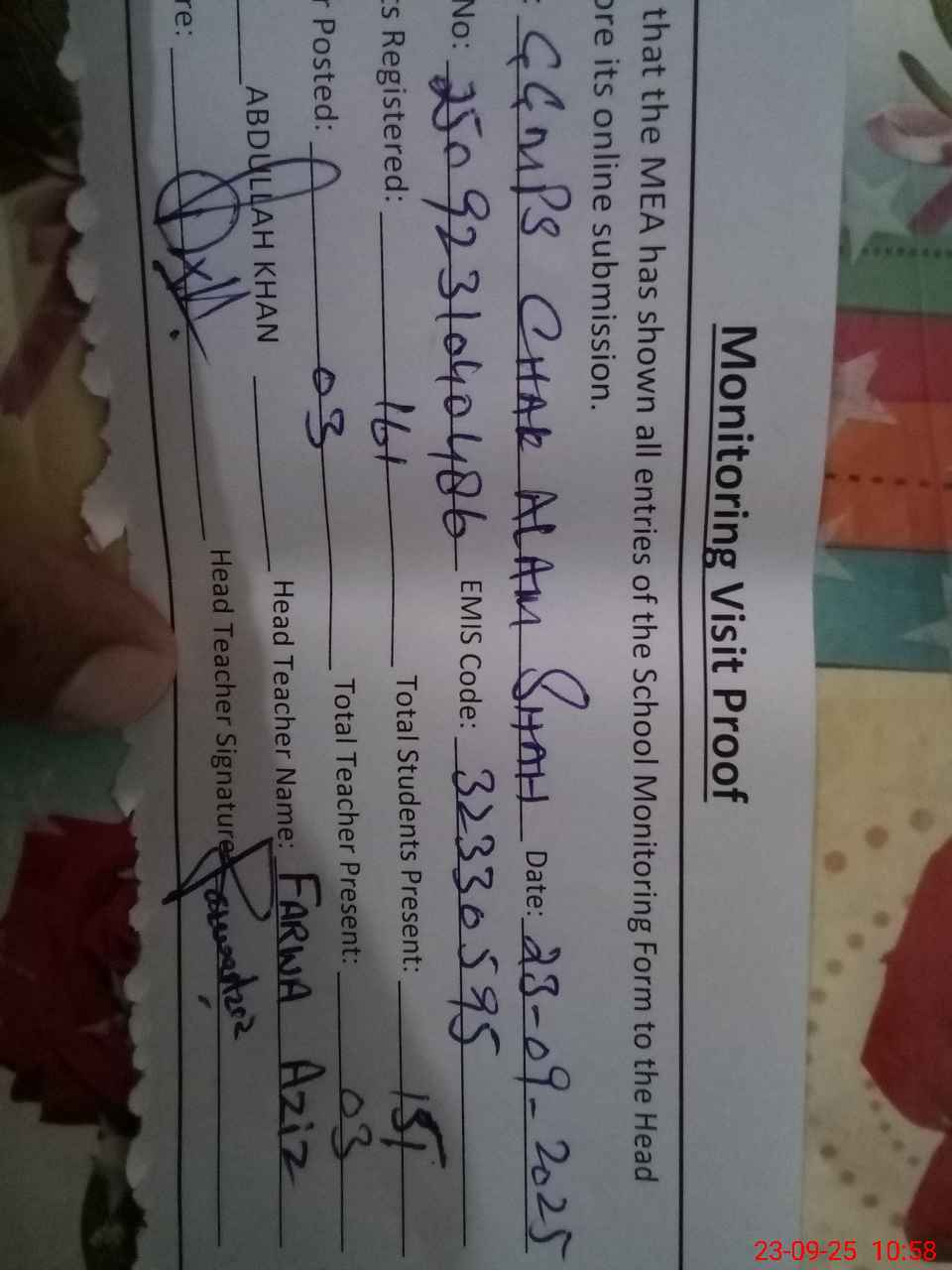 | Attendance Register | Head Teacher | MEA with School | Visit Proof |