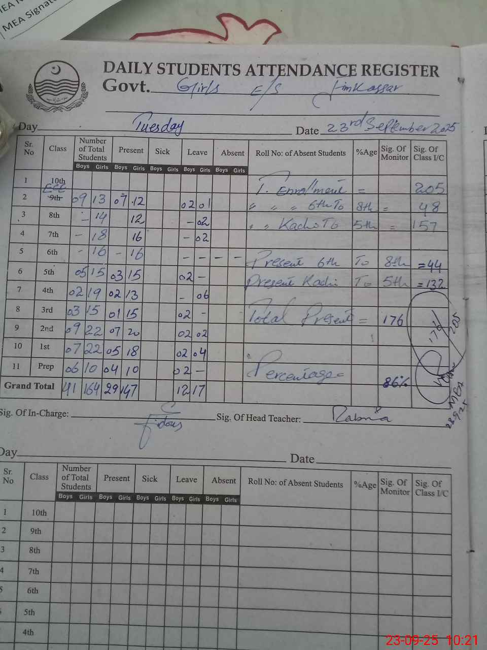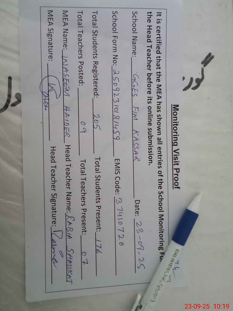 | Attendance Register | Head Teacher | MEA with School | Visit Proof |